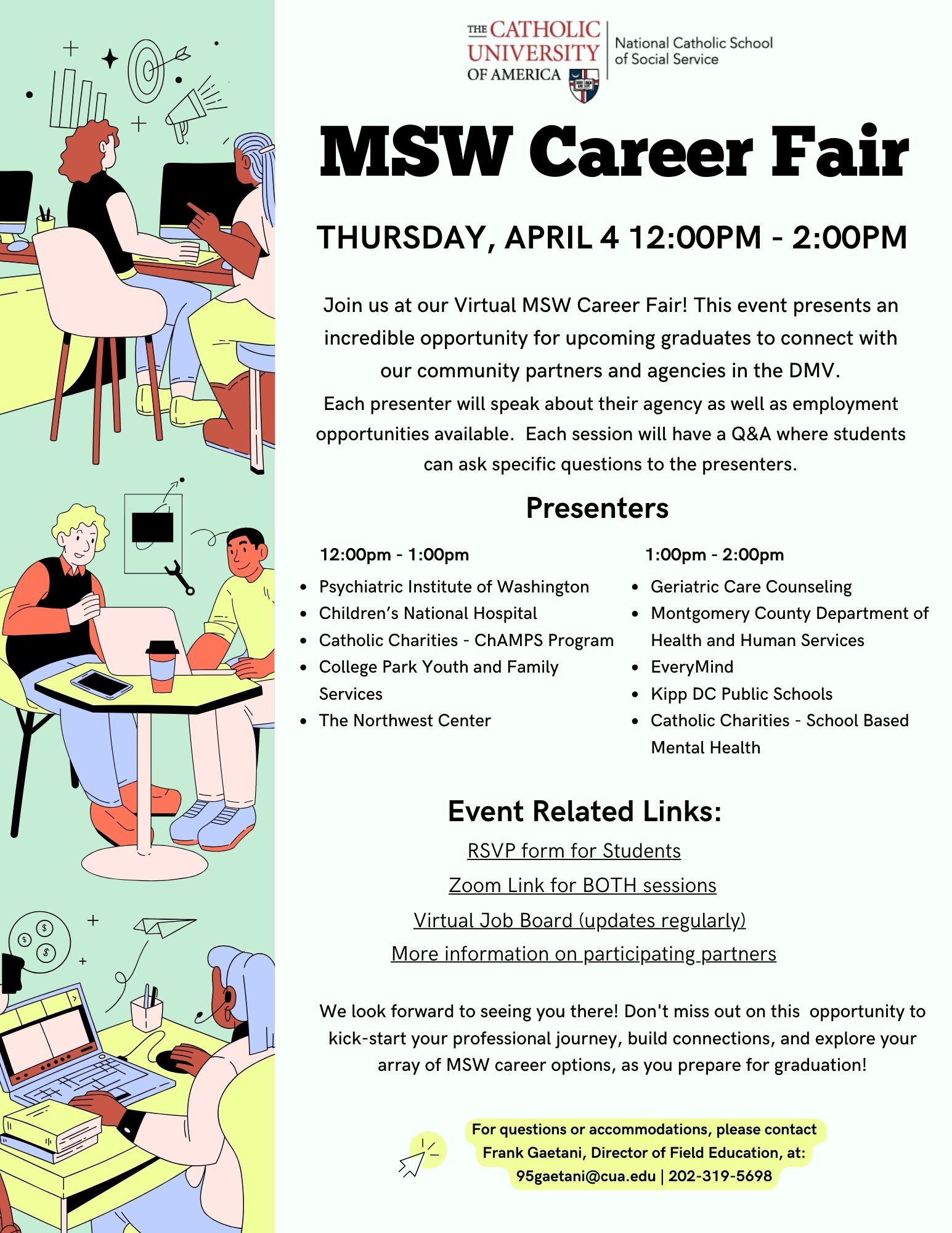 NCSSS is eager to invite you to this year'sVirtual MSW Career Fair! The Fair, happening onThursday, April 4 from 12:00pm - 2:00pm, is an opportunity for graduating students to hear from some of our community partners about employment opportunities following graduation in the DMV. We will have over 10 presenters across the two sessions, who are looking forward to the opportunity to connect with you.
